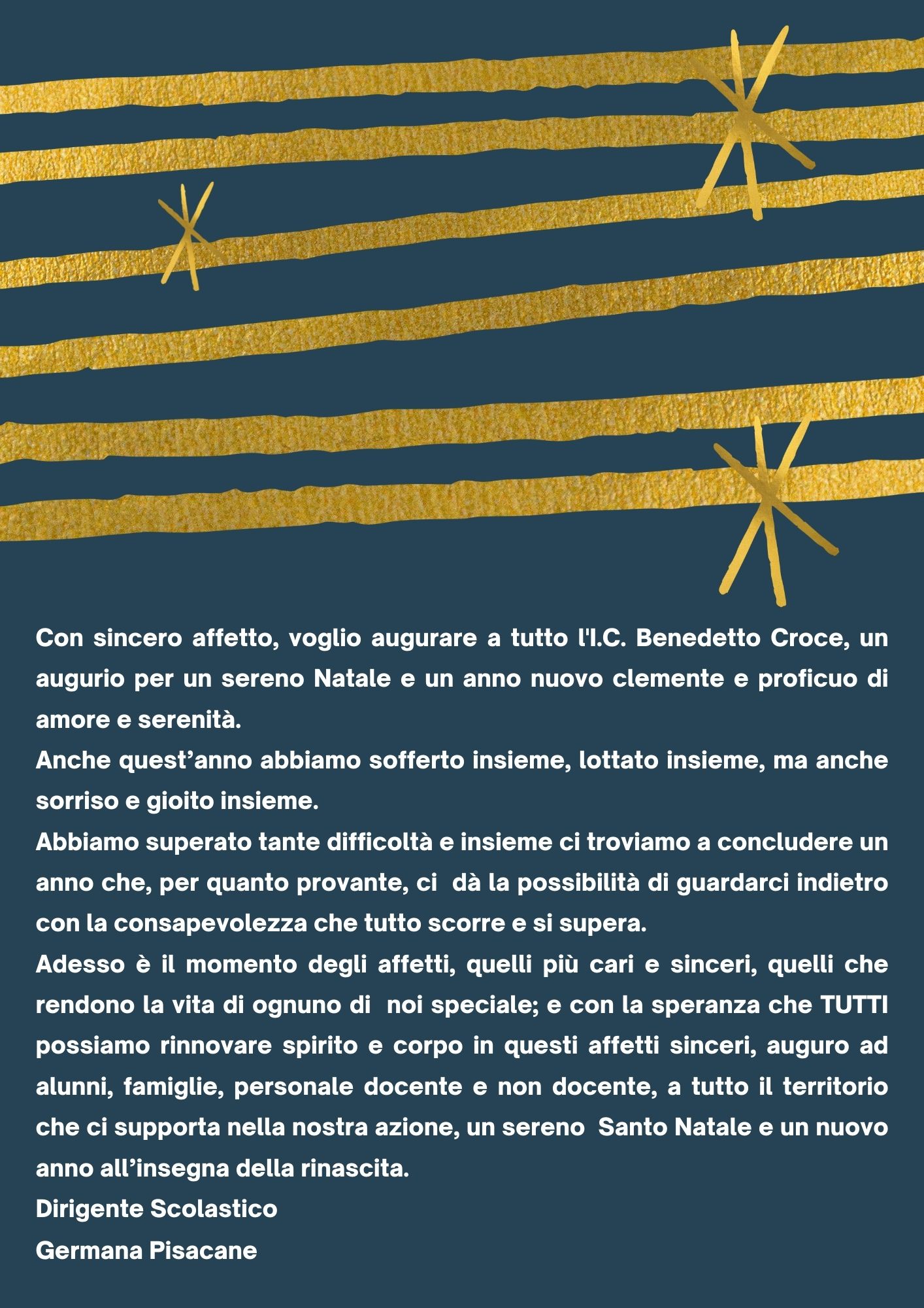 Con sincero affetto, voglio augurare a tutto l’I.C. Benedetto Croce, un augurio per un sereno Natale e un anno nuovo clemente e proficuo di amore e serenità.